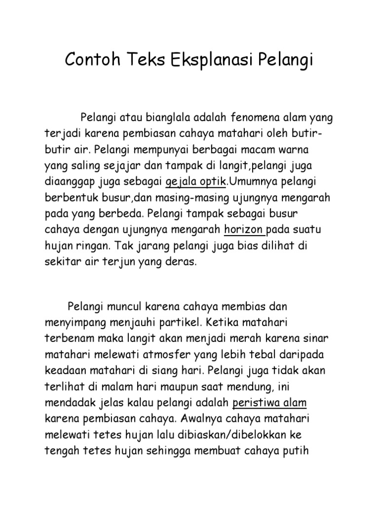 Jika anda membaca sebuah bacaan mengenai peristiwa alam atau bahkan peristiwa. Contoh teks eksplanasi singkat adalah: Menurut mark and katty anderson dalam text types in english (2003) teks eksplanasi adalah bentuk teks yang menyajikan serangkaian peristiwa. Berikut beberapa fitur teks eksplanasi yang harus anda pahami: Teks eksplanasi sendiri merupakan sebuah teks yang berisi penjelasan atas sebuah kejadian atau fenomena.